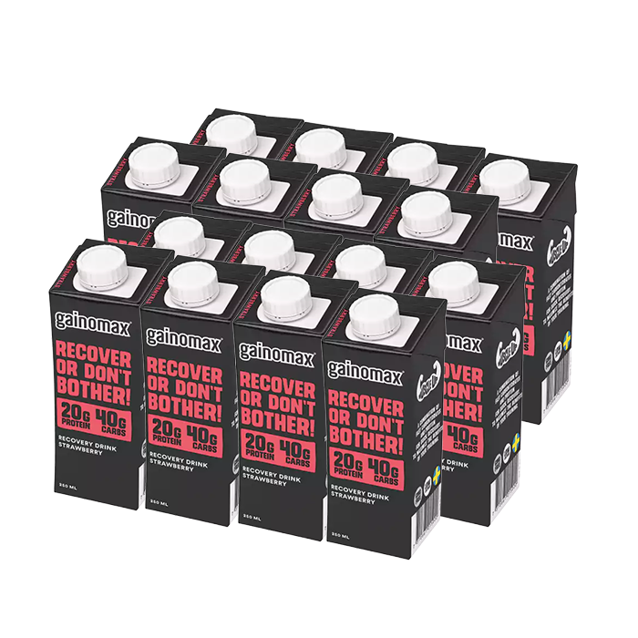 16 x Gainomax Recovery, 250 ml – 16 förpackningar av den smakrika återhämtningsdrycken Gainomax Recovery. Smidig RTD som ger allt du behöver för effektiv återhämtning.