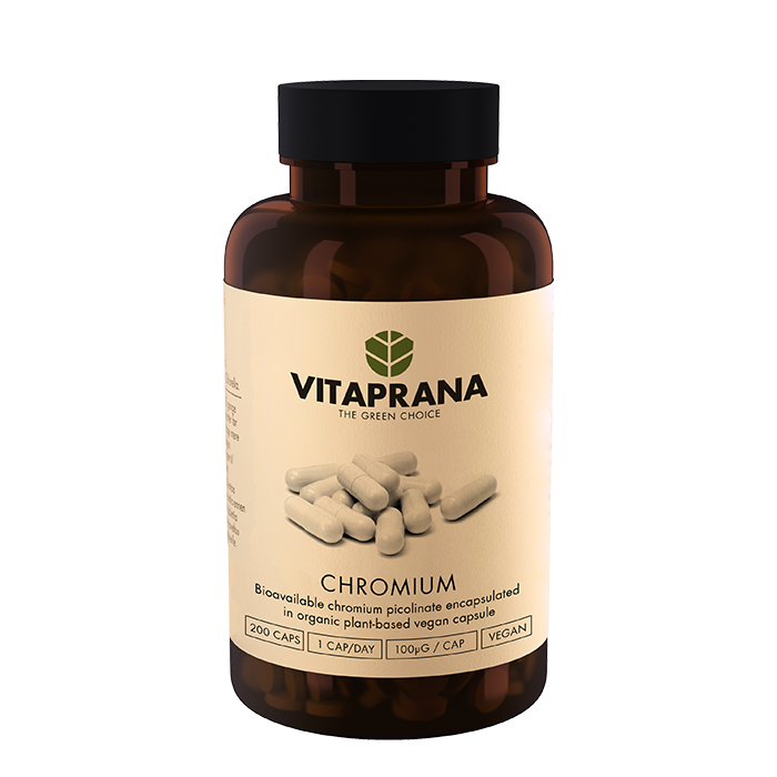 Vitaprana Chromium innehåller krom från krompicolinat, organisk källa med mycket god biotillgänglighet. Veganska ekologiska kapslar som ger 100µg elementärt krom/kapsel.