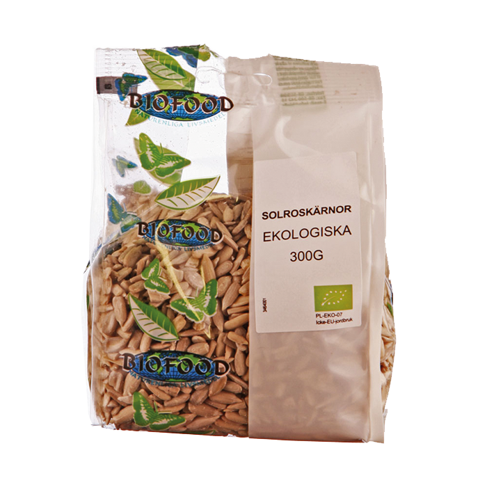 Solroskärnor Hela EKO – Skalade solroskärnor från Biofood som är rika på protein, vitaminer och mineraler. Nyttigt komplement till din dagliga kost eller till brödbak!