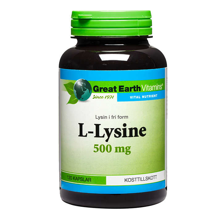 Great Earths L-Lysine innehåller 120 kapslar där varje kapsel innehåller 500 mg L-Lysine.