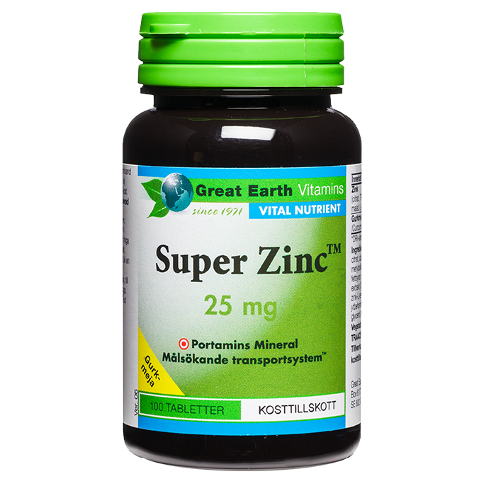 Super Zink 25mg från Great Earth är ett zinktillskott med det speciella transportsystemet Portamins för ett optimalt upptag av kroppen.