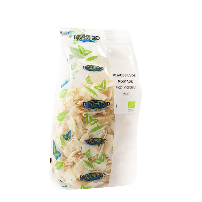 Kokosskivor Rostade EKO – Ekologiska kokosskivor från Biofood som lämpar sig utmärkt som smaksättning, garnering eller tillbehör i såväl matlagning som bakverk!