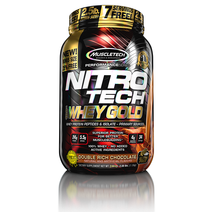MuscleTech Nitro-Tech 100% Whey Gold, med vassleprotein isolat och peptider som primära proteinkällor. Om du menar allvar med din tränings resultat!