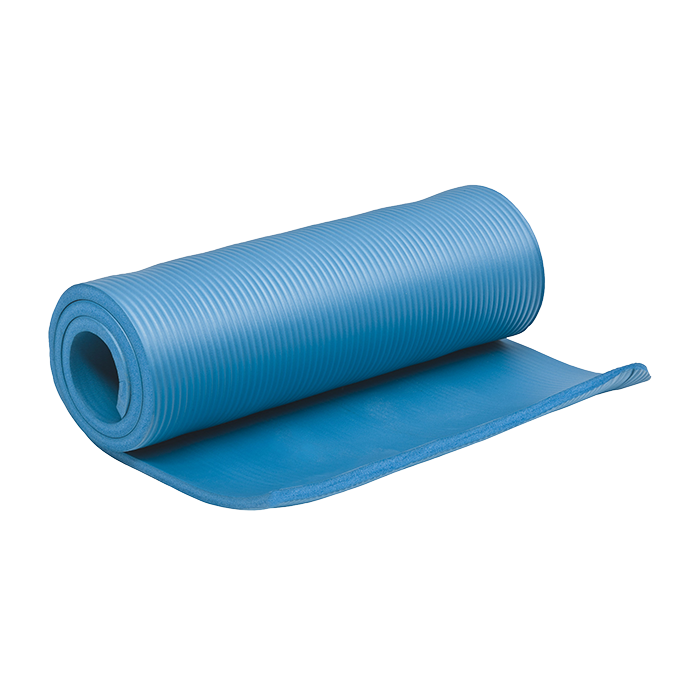 15 mm tjock pilatesmatta från Master Fitness med ett gummiband som håller ihop mattan. Tillverkad av NBR
