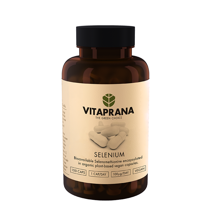 Vitaprana Selenium ligger i veganska ekologiska kapslar som innehåller selen från selenmetionin som är en organisk källa med mycket god biotillgänglighet.