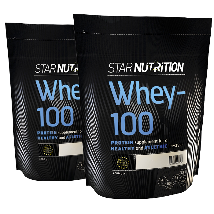 2 x Whey-100, 4 kg: Ett kompromisslöst kvalitetsprotein tillverkat för dig som kräver det bästa! För maximal muskeluppbyggnad och fettförbränning!