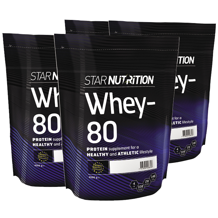 4 x Whey-80, 4 kg: ett komplett proteinpulver som är anpassat för dig som bygger muskler eller vill bränna fett på ett effektivare sätt!